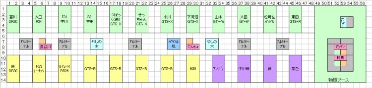| 下のレイアウトで上の段の一番右が店長 東田 GTS−R(実際はメインブース横でえらそうな配置でした) | ||||||||||||||||||||||||||||||||||||||||||||||||||||||||||||||||||||||||||||||||||||||||||||||